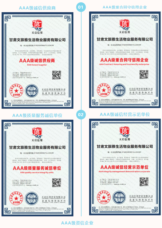 2021年,甘肃文旅雅生活物业服务有限公司认真贯彻落实习近平新时代中国特色社会主义思想,坚决落实集团公司各项决策部署。按照集团公司高质量发展要求,结合自身发展需要,公司于9月份正式启动3A体系认证工作,经过权威认证机构对公司信用管理、制度建设、管理体系等方面综合评估,10月底公司顺利通过3A体系认证,使得公司在管理水平、制度建设方面有了进一步完善及提升,增强了公司核心竞争力和品牌影响力,为公司高质量发展奠定了坚实的基础。