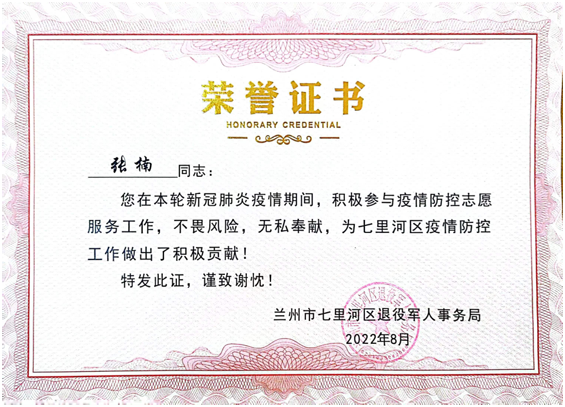 2月10日,兰州市政建设集团第一工程公司收到兰州市退役军人服务中心发来的一封感谢信,对党员张楠同志在疫情期间勇于担当防疫志愿服务做出的积极贡献表示崇高的敬意和衷心的感谢。张楠同志在新冠病毒疫情防控工作的关键时期,踊跃参加兰州“天河救援队”,奋勇当先、冲锋向前,践行了“奉献、友爱、互助、进步”的志愿服务精神,为群众筑起了疫情防控安全线。