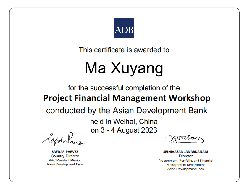 此次培训重点对亚行采购政策、合同管理与合同计划、亚行财务尽职分析要求、项目会计核算、项目财务报表、项目审计等主题进行授课。通过演讲、案例研究、小组讨论、结业测试及经验丰富的执行机构分享经验等方式使参训人员加深了解亚行贷款采购、财务政策/规定并拓展实践知识。PA视讯国际金融组织贷款项目管理办公室一名同志代表亚行贷款甘肃环境可持续乡村振兴与发展项目作了大会交流发言,分享了项目管理工作中的经验和关注点。培训授课结束,三名参训人员获得了结业证书。
